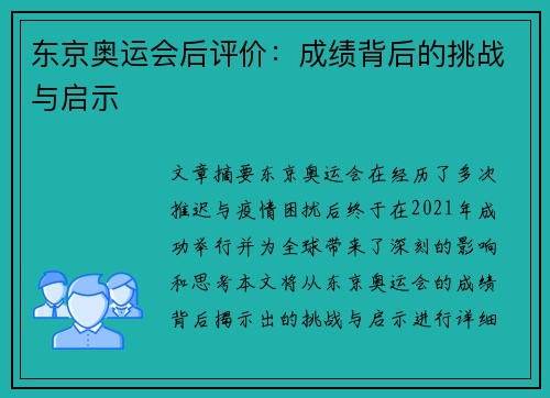 文章摘要:东京奥运会在经历了多次推迟与疫情困扰后,终于在2021年成功举行,并为全球带来了深刻的影响和思考。本文将从东京奥运会的成绩背后揭示出的挑战与启示进行详细分析。首先,疫情对赛事组织的巨大冲击,...