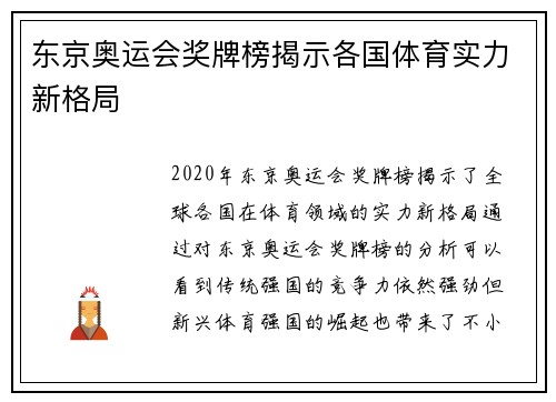 2020年东京奥运会奖牌榜揭示了全球各国在体育领域的实力新格局。通过对东京奥运会奖牌榜的分析,可以看到传统强国的竞争力依然强劲,但新兴体育强国的崛起也带来了不小的震动。本文将从几个方面深入探讨东京奥运...