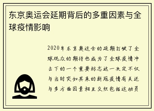 2020年东京奥运会的延期,打破了全球观众的期待,也成为了全球疫情冲击下的一个重要标志。这一决定不仅与当时突如其来的新冠疫情有关,还与多方面因素相互交织,包括运动员健康、安全问题、全球经济形势的变化以...
